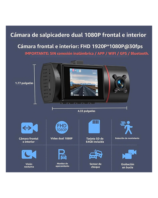 Cámara de tablero doble frontal e interior con tarjeta de 64 GB