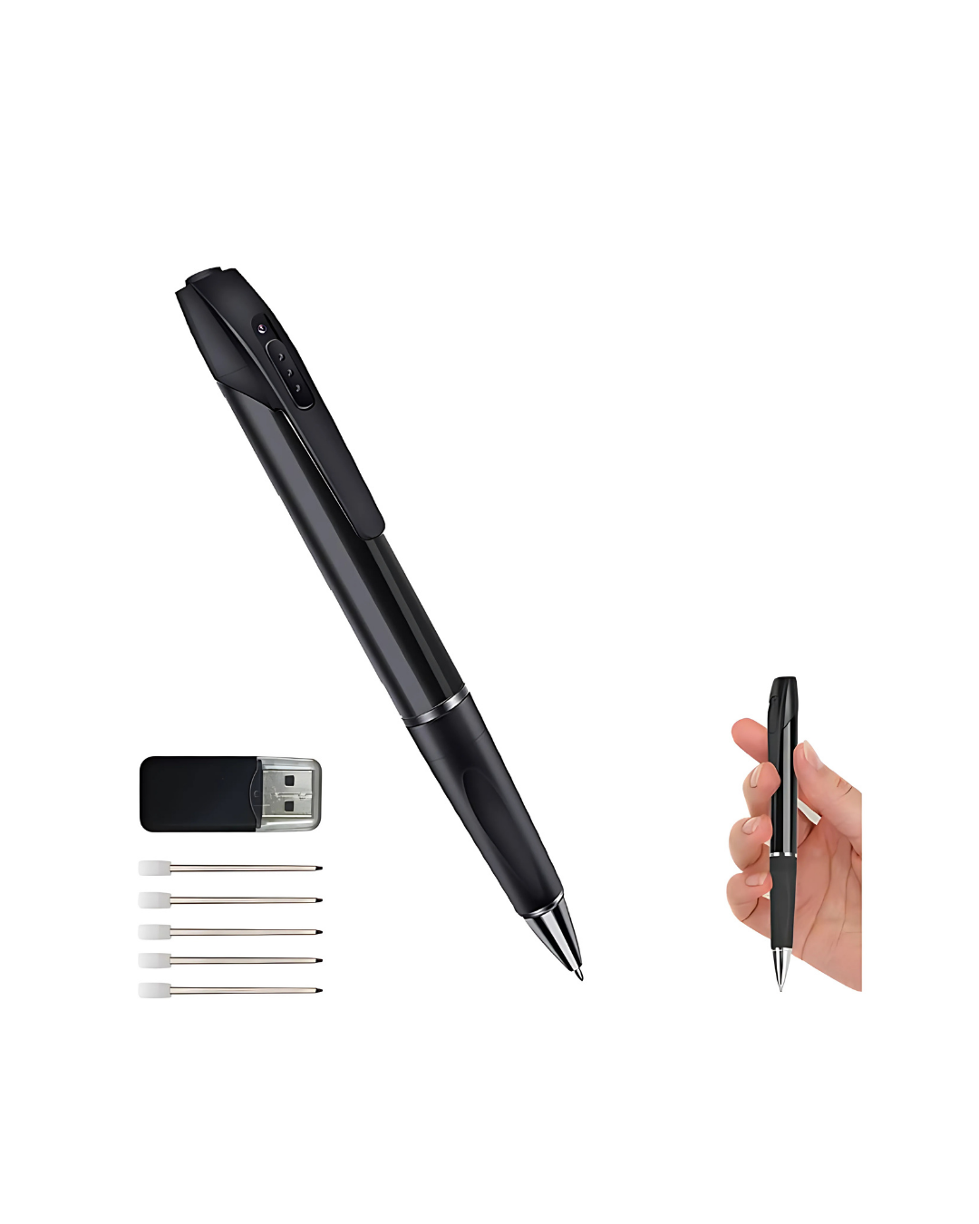 Es un dispositivo portátil de grabación que combina la funcionalidad de un bolígrafo con una cámara oculta. Es ideal para reuniones de negocios, toma de notas visuales, vigilancia discreta y seguridad personal.
